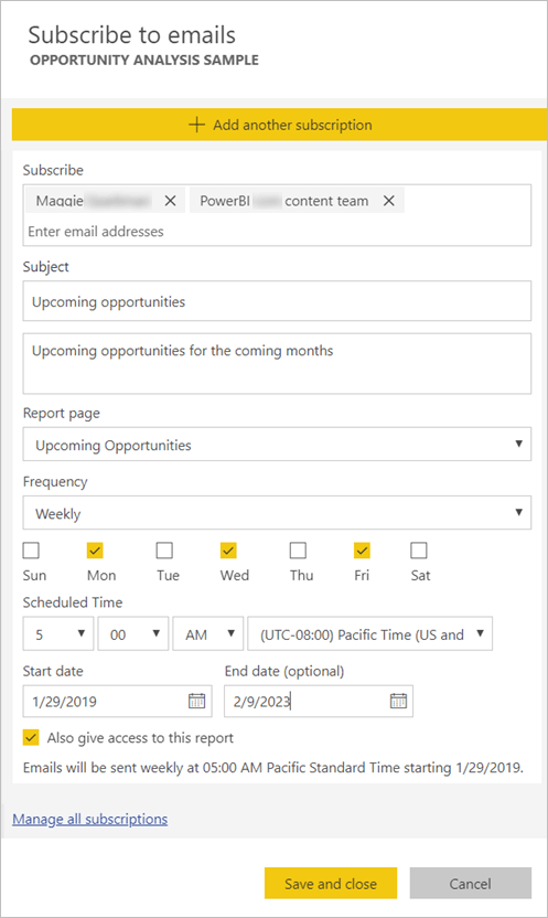 This type of recurrence is already supported by Power BI’s, but its scheduling system is severely limited to 3 options. Users can choose between once a day, once a day after data refresh, and once a week. This means that you can’t use Power BI alone to inform someone twice a day or only once a month.