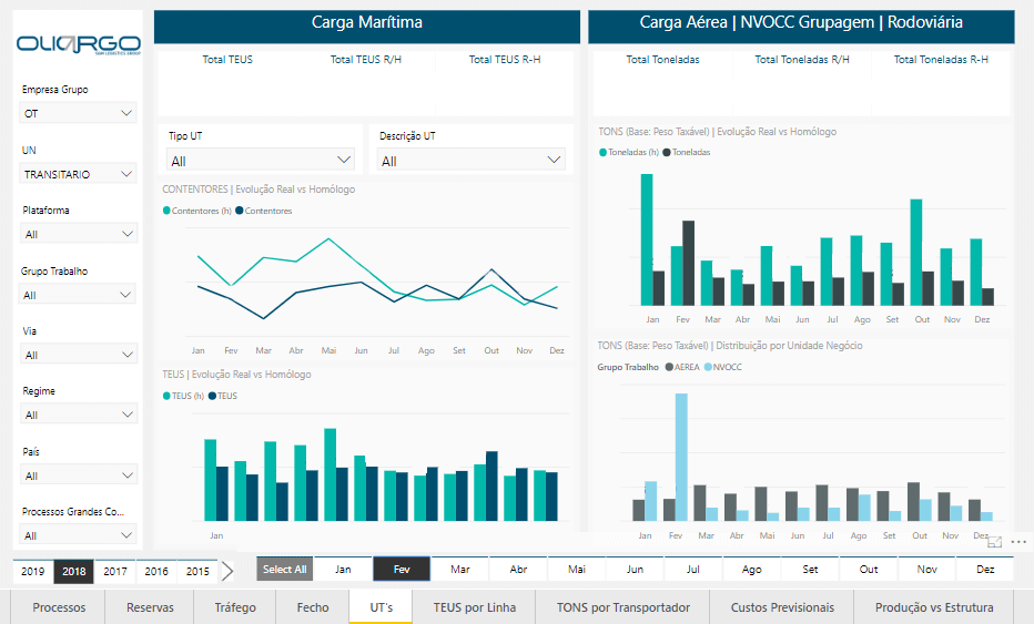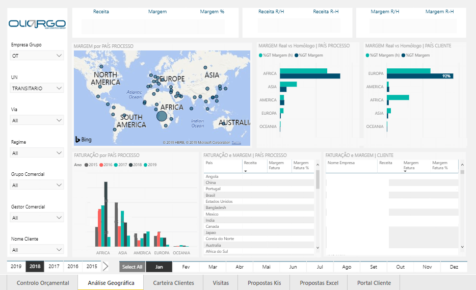 DevScope started by tackling the commercial and operational areas, giving Olicargo a clear vision over their expenses, budgets, sales and margins, processing, and customer portfolio. The results were great, and Olicargo decided to expand Power BI to its remaining business areas. During the following months, detailed Business Intelligence reports were created for finance, treasury, marketing management, human resources, procurement, warehouse cargo, and fleet management.